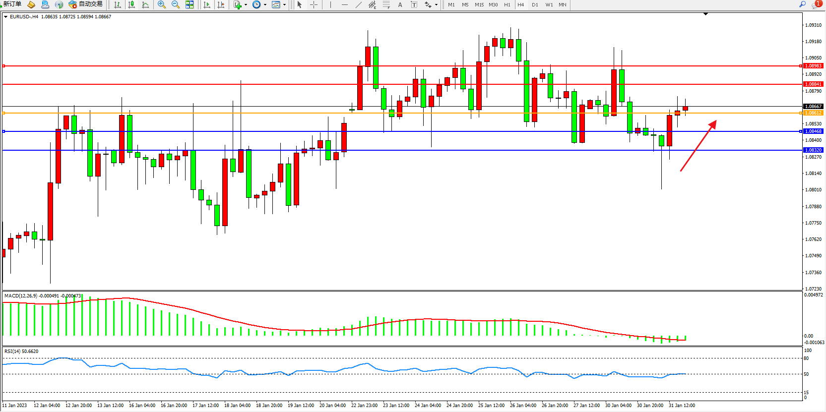 交易策略:1.08612上方看涨,目标1.08841、1.08983
