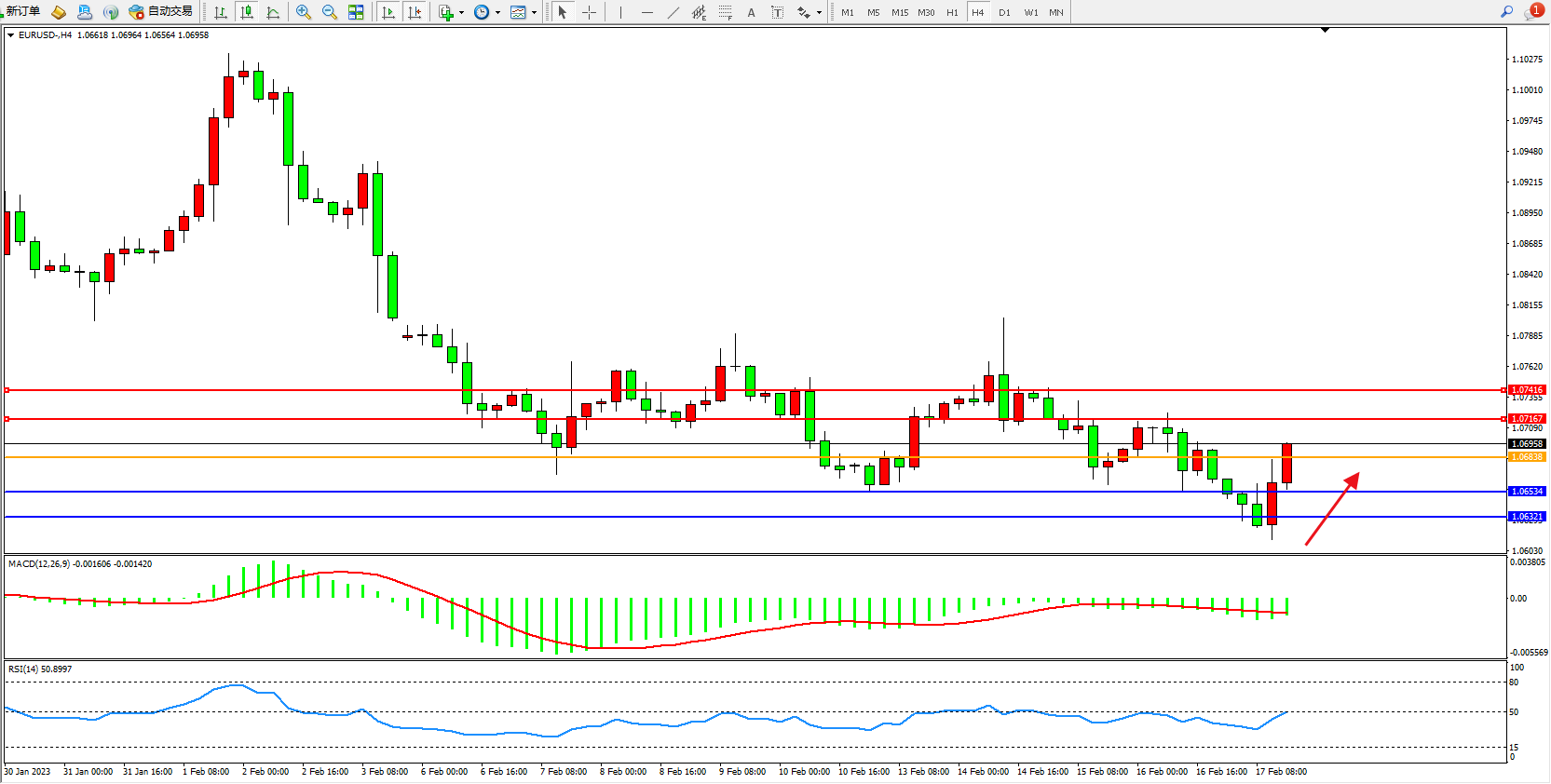 欧元美元EURUSD—4小时K线图显示: