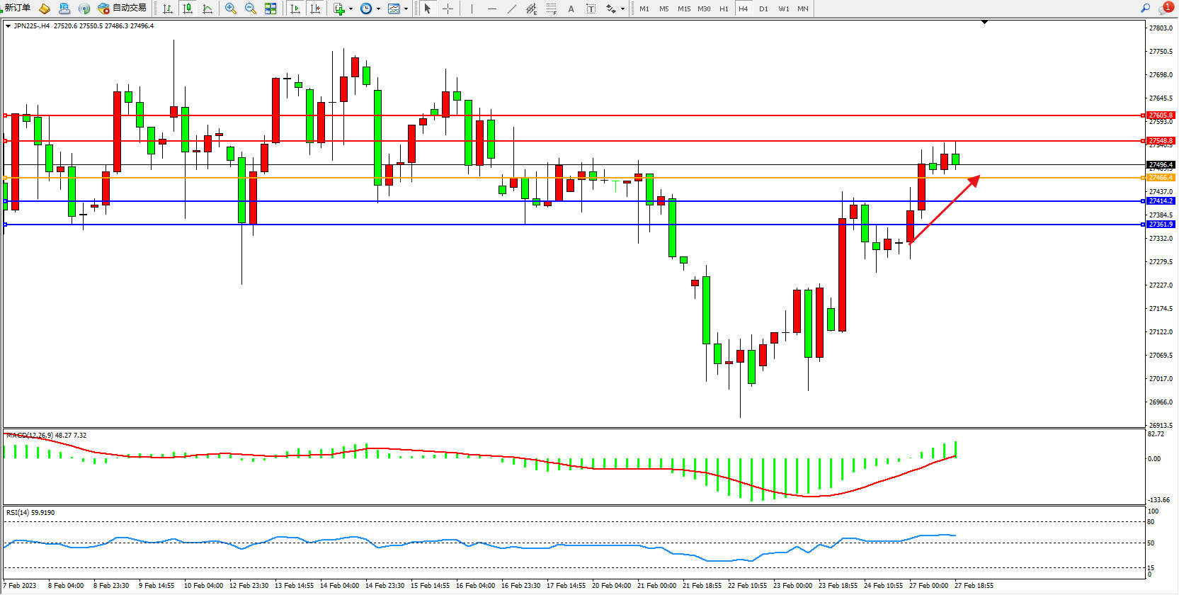 日经指数JPN225——4小时K线图显示: