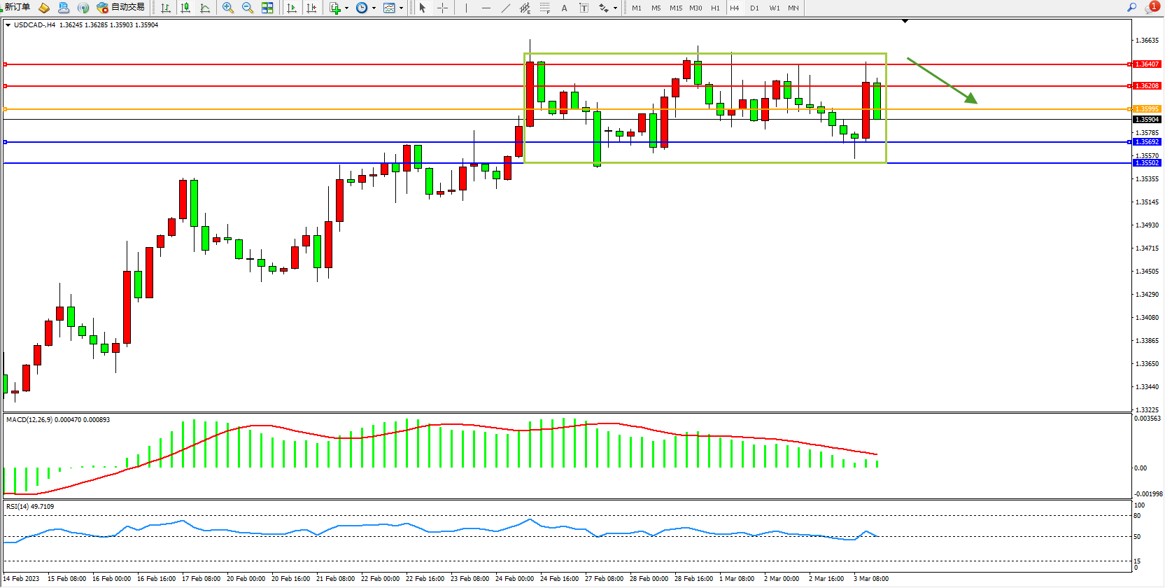 美元加元USDCAD——4小时K线图显示: