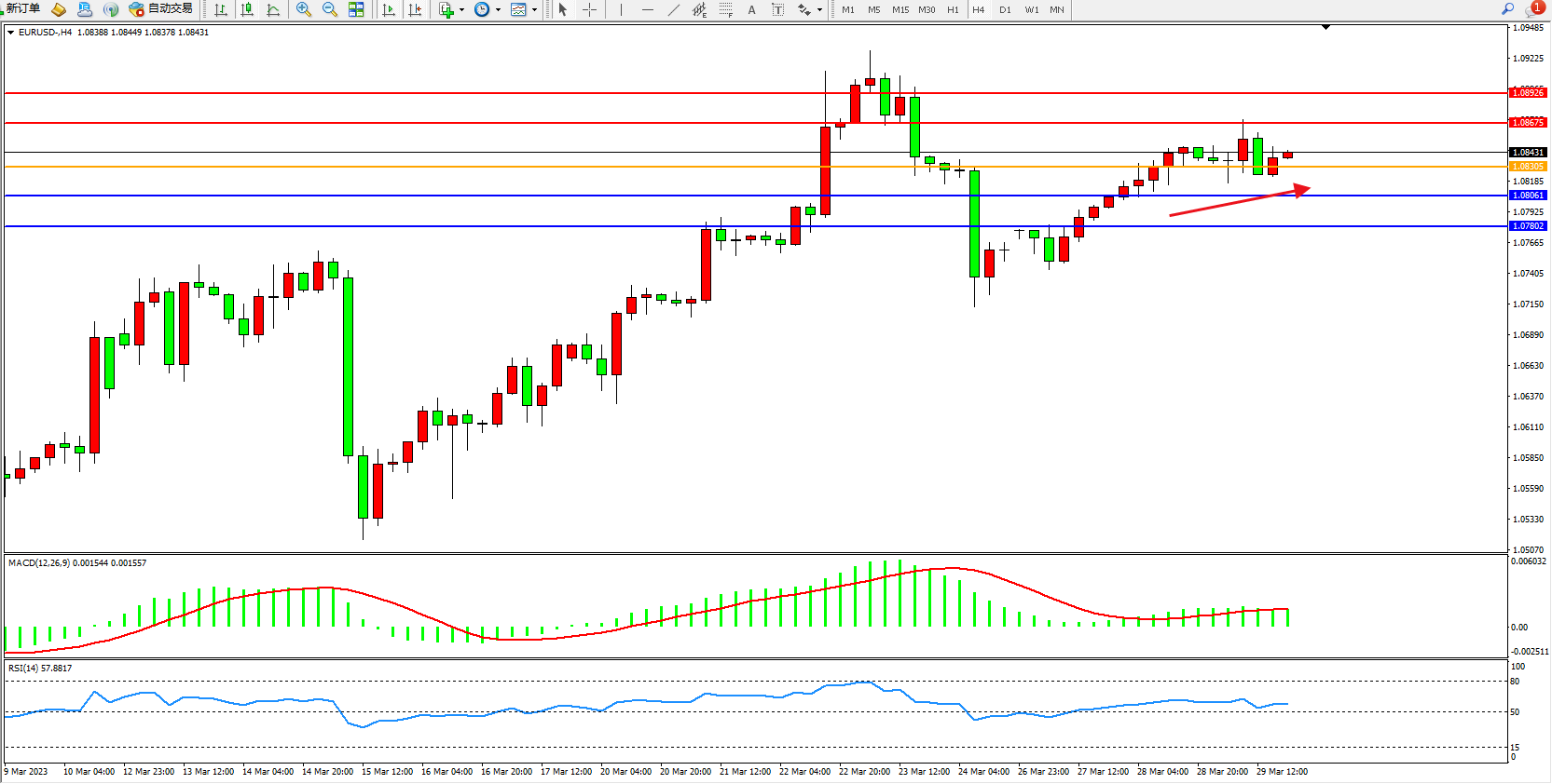欧元美元EURUSD—4小时K线图显示: