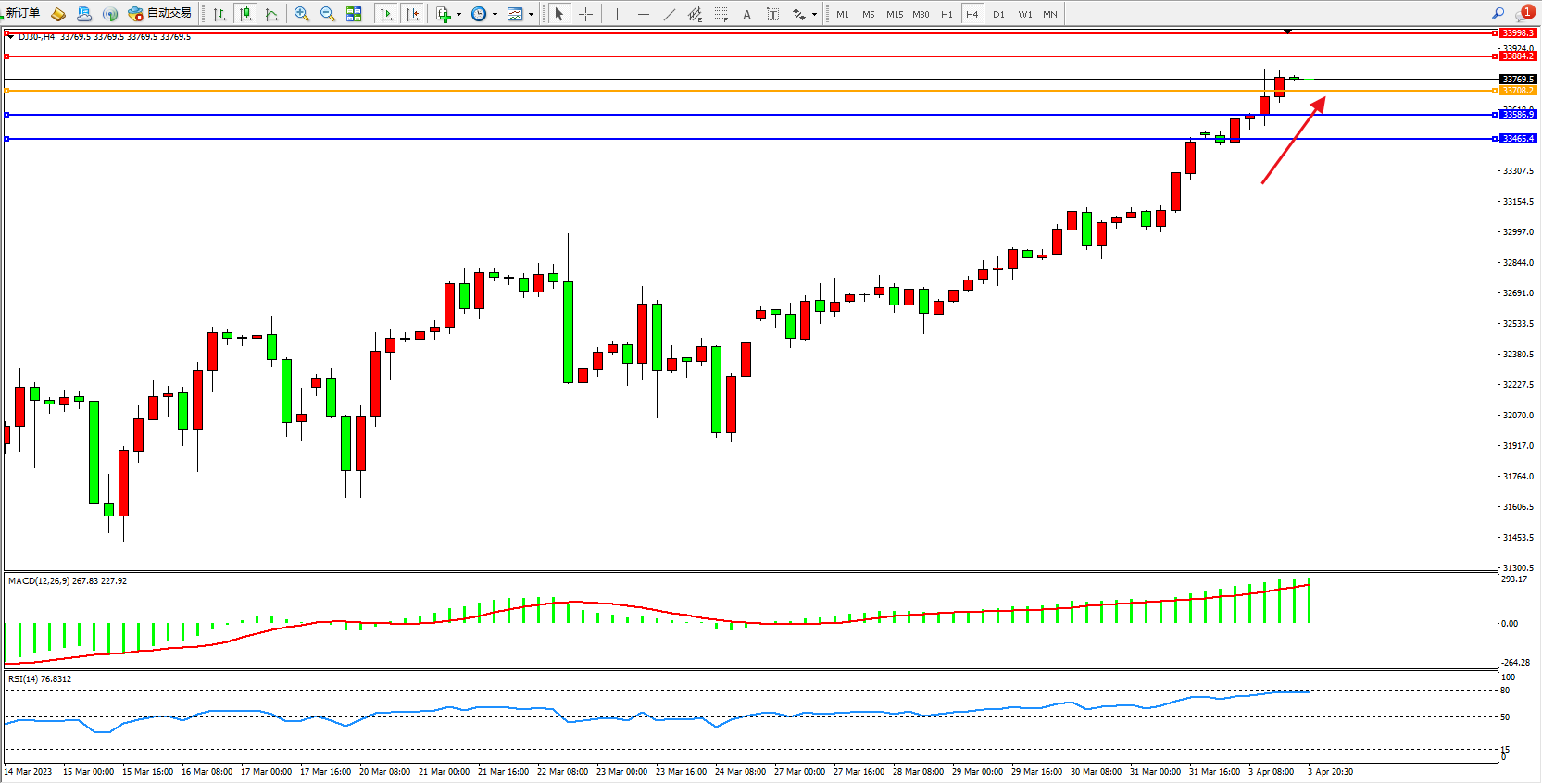 道琼斯指数DJ30——4小时K线图显示: