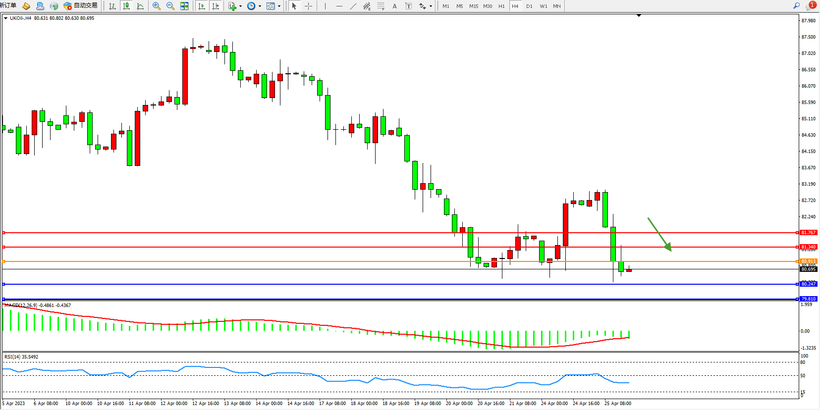4小时图看:高位空头动力急速下挫,短期跌势或将延续,市场整体处于空头情绪笼罩中,MACD指标处于0轴线下侧徘徊,RSI指标处于空头区域弱势整理;