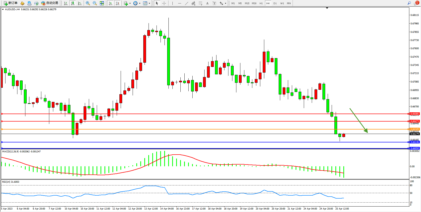 交易策略:0.66349下方看跌,目标0.66146 0.66050