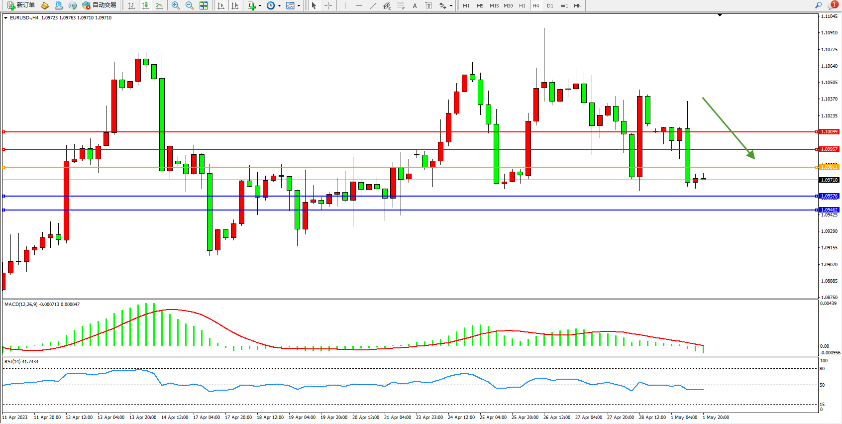 欧元美元EURUSD—4小时K线图显示:
