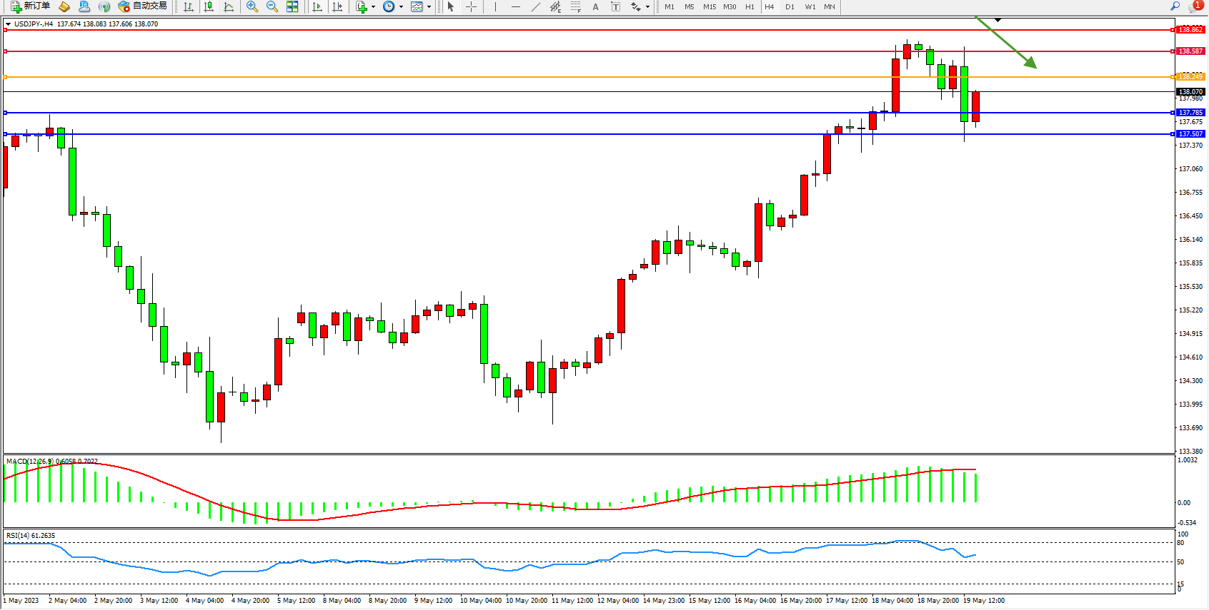 美元兑日圆维持138.070附近震荡,受助于美国国债收益率上升,美元兑日圆周五在六个月高位附近持坚,对华盛顿债务上限谈判的乐观情绪助推了利率进一步上升且维持更长时间的预期。
