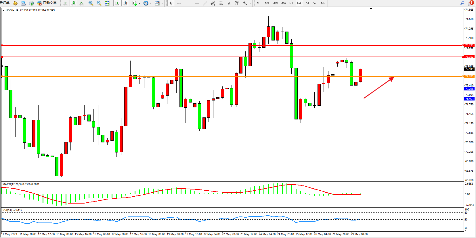 原油维持72.949附近震荡,隔夜原油市场将提前休市,无重要经济数据出炉,市场交投比较清淡。投资者需要留意美国债务上限协议的相关消息和市场情绪变化。