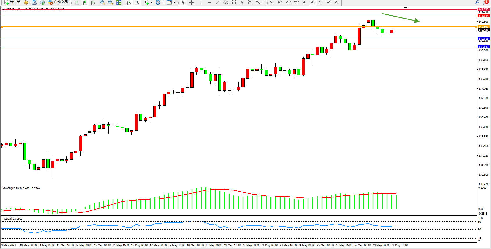 交易策略:140.561下方看跌,目标141.045 141.337