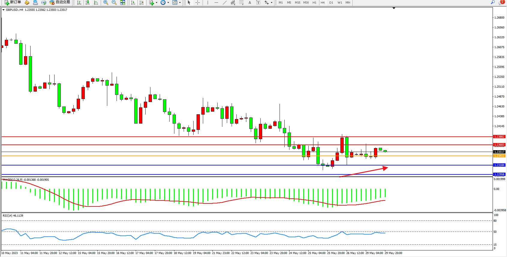 备选策略:1.23412下方看跌,目标1.23184  1.22958