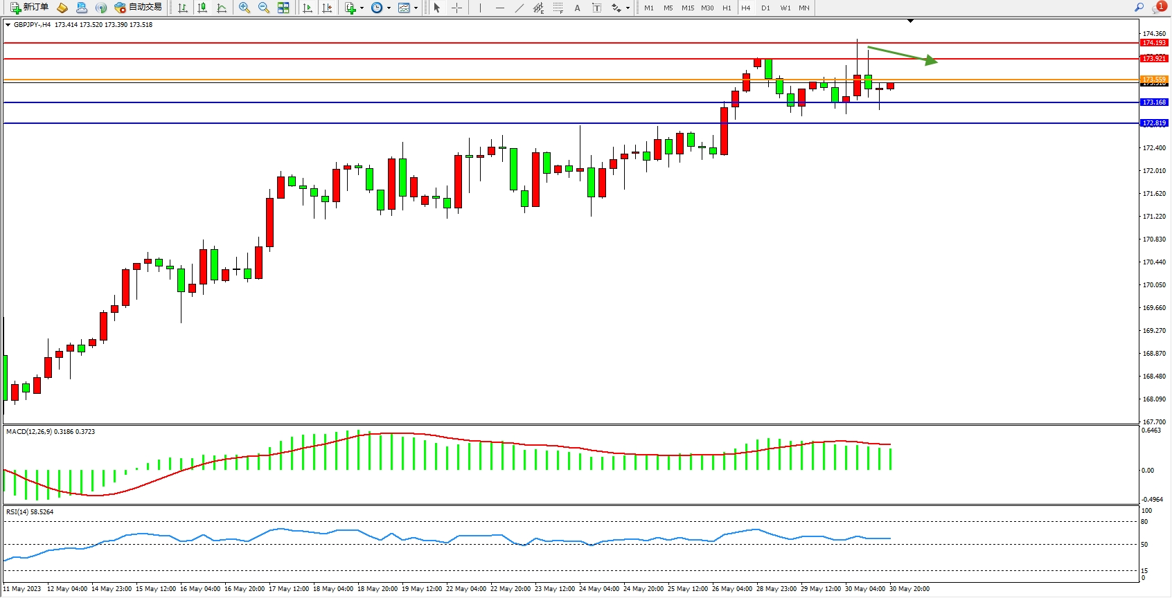 交易策略:173.559下方看跌,目标173.168 172.819