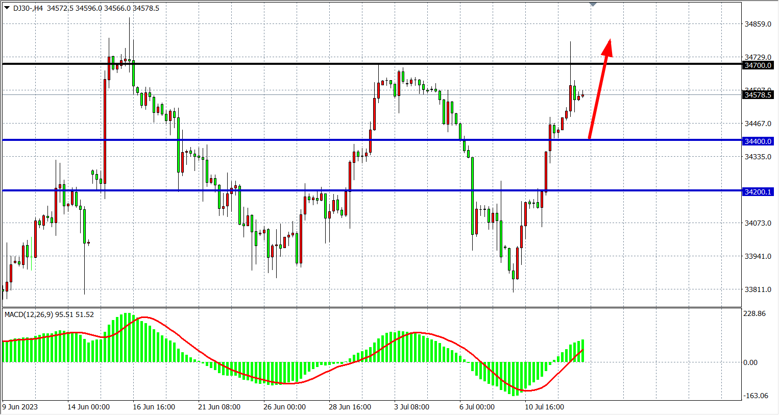 4小时图看,道指进一步走高挑战34700关口,MACD量能维持零轴上放量,行情有望延续涨势,支撑上移34400附近,上方阻力34700-35000。