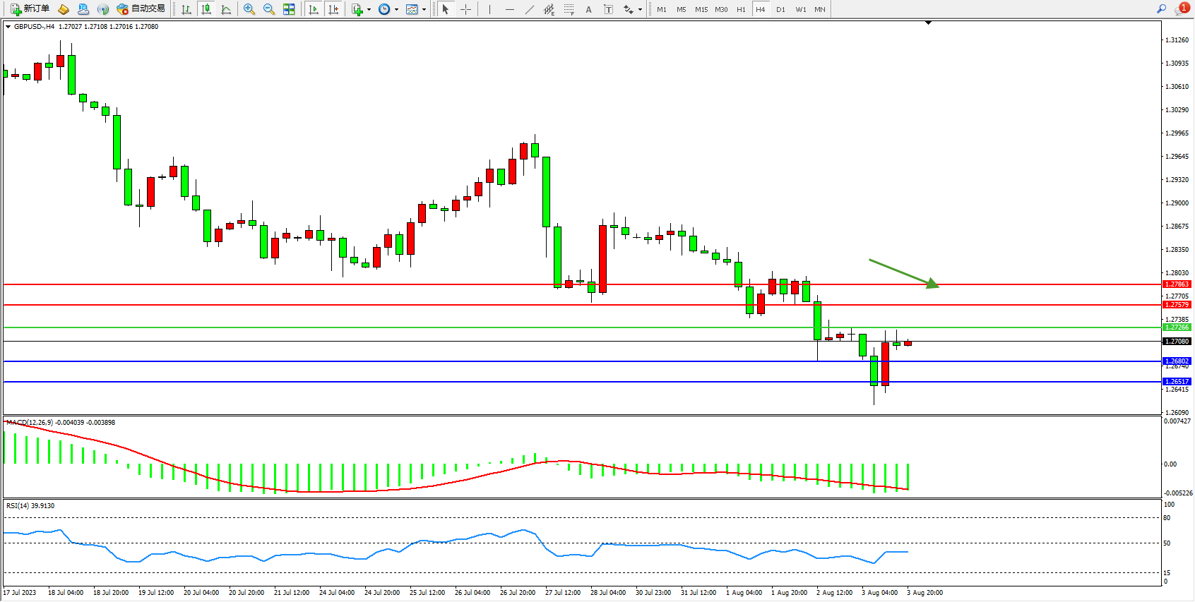 交易策略:1.27266下方看跌,目标1.26802  1.26517