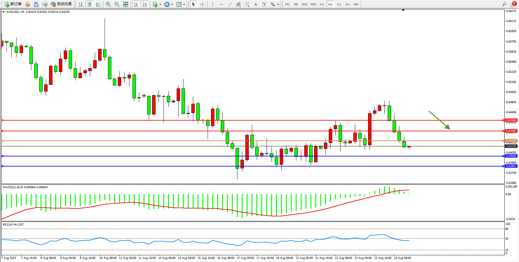 交易策略:0.64239下方看跌,目标0.64000 0.63842