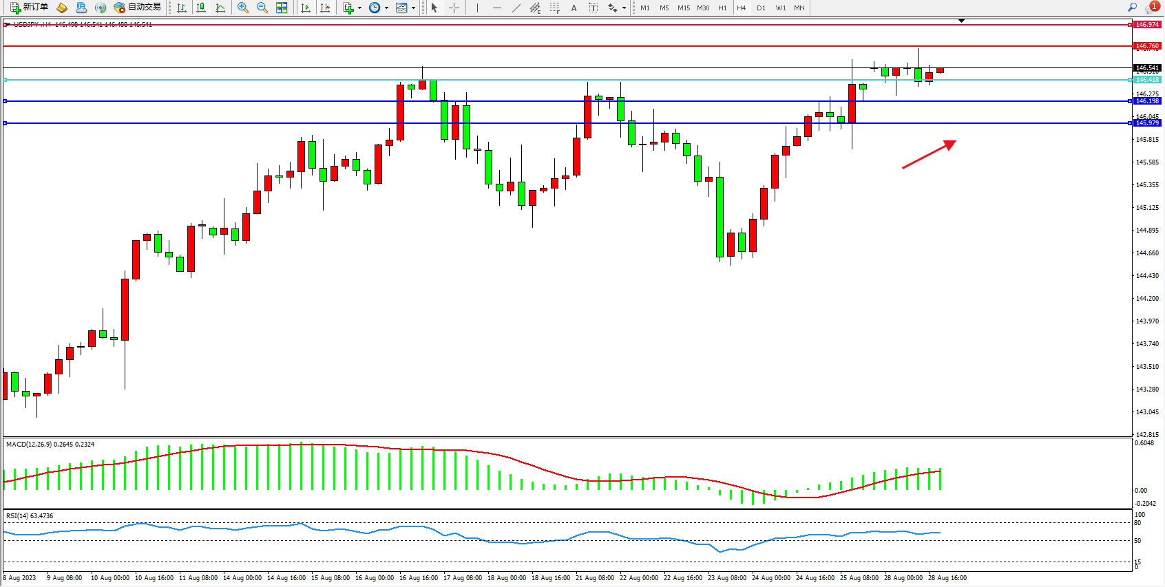 交易策略:146.418上方看涨,目标146.760 146.974