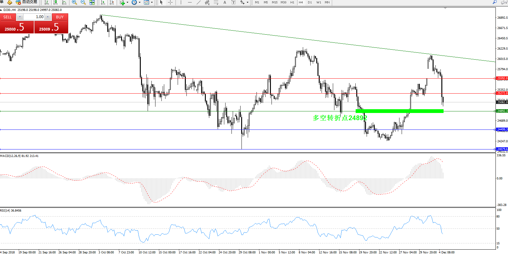 道琼斯指数DJ30—4小时K线图显示: