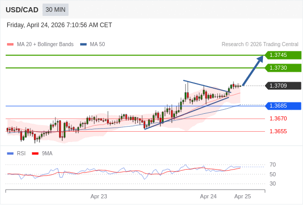 在 1.3685 之上,看涨,目标价位为 1.3730 ,然后为 1.3745 。