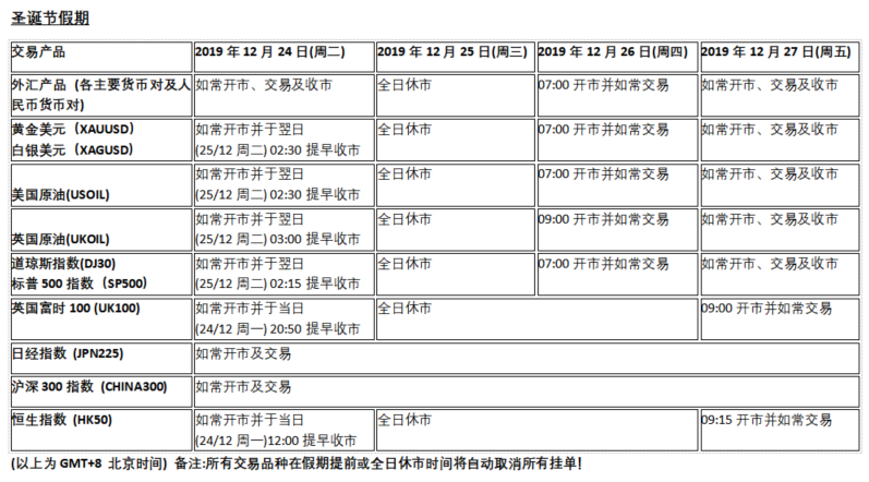由于各地市场圣诞节假期及元旦假期影响,以下产品的交易时间将于2019年12月24日(周二)至12月27日(周五)以及2019年12月31日(周二)至2019年1月2日(周四)期间提前或全日休市,敬请留意!