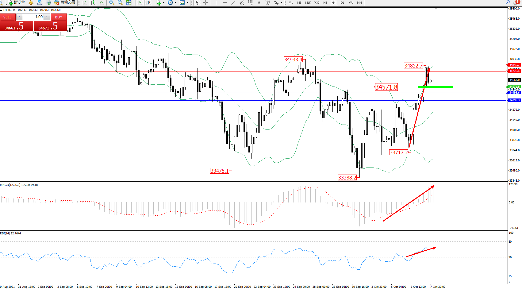 技术点评:多头动力延续布林带指标上轨附近持续震荡上扬,高位抵达34852位置后遇阻震荡回撤,多头上扬动力态势良好,有继续攀升态势,布林带指标呈张口走势后有开始收口迹象,MACD指标处于多头区域持续震荡上扬中,RSI指标处于多头区域维持整理平移中;