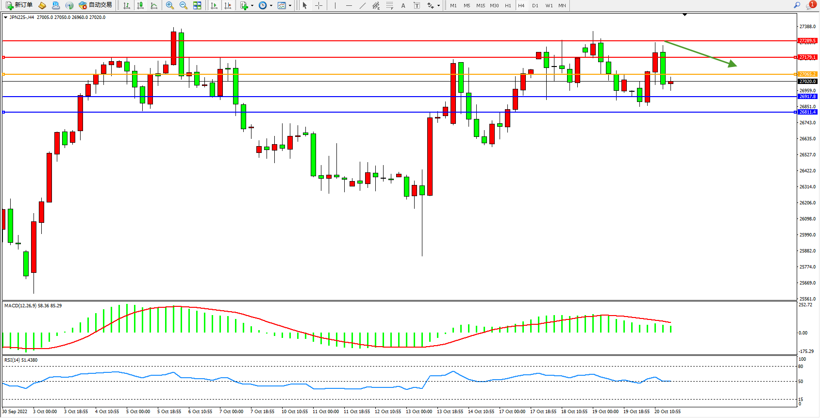 日经指数JPN225——4小时K线图显示: