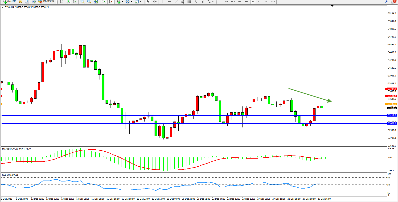 道琼斯指数DJ30——4小时K线图显示: