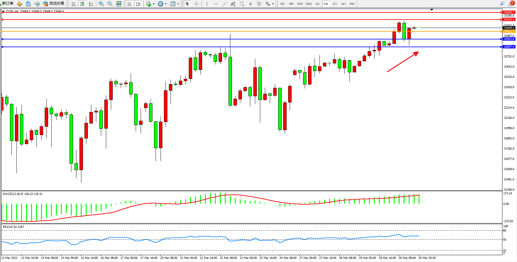 交易策略:33012上方看涨,目标33134 33209