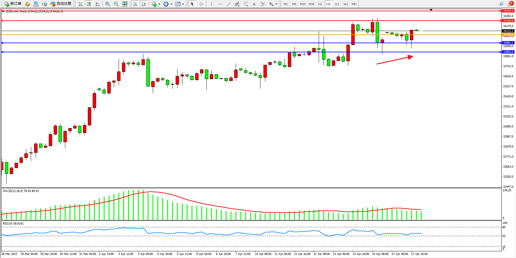 道琼斯指数DJ30——4小时K线图显示: