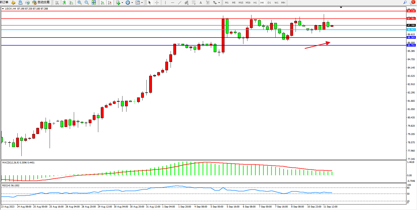 原油USOil——4小时K线图显示: