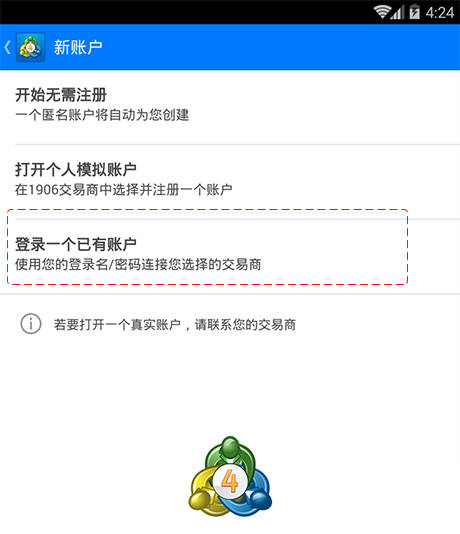 1. 成功安装 MT4 后,在手机桌面上点击 MT4 图标打开应用。首次打开时页面显示如下。