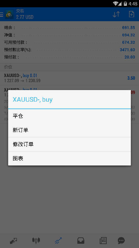 2.在交易页面,长按交易订单,弹出如下窗口。可选择对该订单进行平仓、修改订单、新订单或图表。